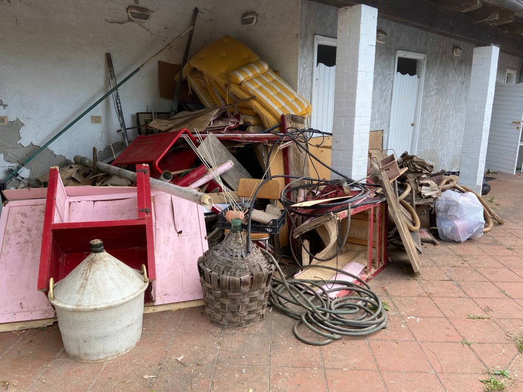 Het was onvermijdelijk(er dan ik vooraf dacht) vooral een opruim-, weggooi-, omzaag- en schoonmaakwerkvakantie. Wat je op de foto ziet is nog maar een deel van de troep die de deur uitgaat. Vooral de spullen in de kelder moesten het ontgelden. Het leverde wel een heel mooie ruimte op, waar de grove gestapelde stenen uit de streek weer als muren zichtbaar zijn geworden en ik nu een paar stevige planken voor het grote gereedschap heb.